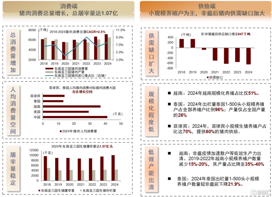 东南亚猪肉消费稳步增长、供给存缺口,养殖规模化率较低且散户加速退出。整体看,根据USDA,2024年越南/泰国/菲律宾东南亚三国屠宰量分别为5645/2346/2074万头。我们认为,当地供给缺口叠加散户出清背景下,为具备资金与技术优势的头部企业创造机遇。
