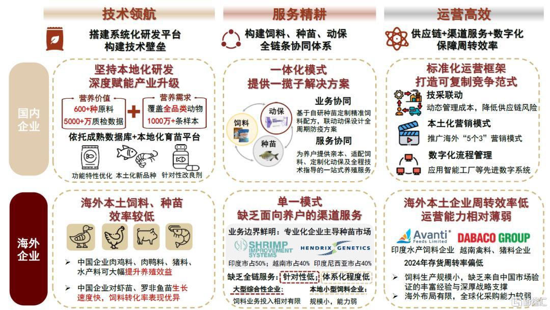 国内饲料企业出海以种苗、饲料、动保全链条一体化能力为核心抓手,凭借多年沉淀的动物营养配方研发硬实力,以及融合快周转、数字化、本土化营销的极致效率运营体系,构建起核心竞争壁垒,实现从优质产品供给到全流程服务覆盖的出海模式,向海外市场高效输出与规模化复制。
