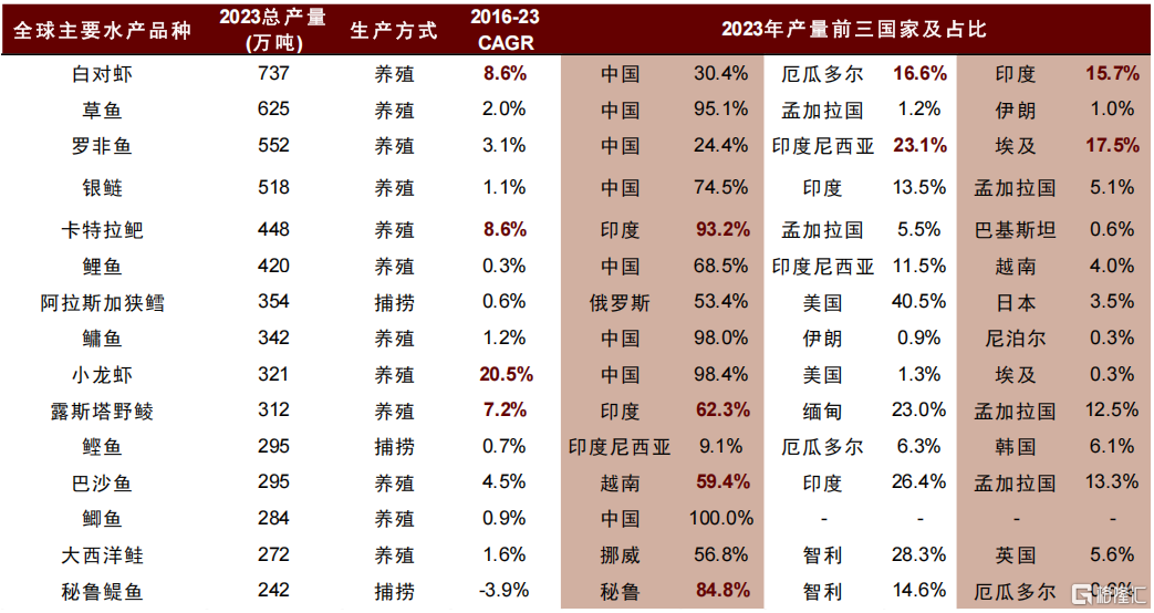 注:主要水产品种仅筛选鱼类与甲壳类水产;数据截至2023年资料来源:FAO,中金公司研究部