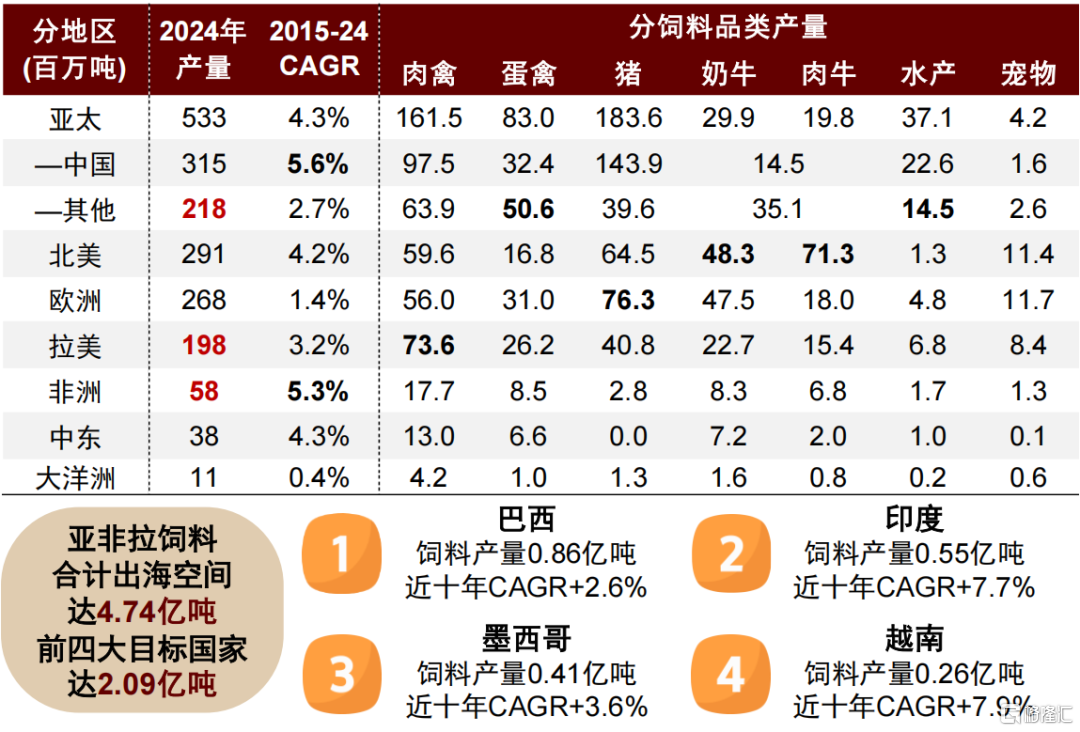 全球14亿吨饲料市场稳健扩容,亚非拉发展中地区出海空间近5亿吨。根据Alltech数据,2024年全球饲料总产量达13.96亿吨,近十年CAGR为3.6%,维持稳步扩容态势。1)分地区:饲料龙头目标出海地区市场空间可观,2024年亚太除中国、拉美、非洲饲料产量合计4.74亿吨,其中非洲市场近十年CAGR为5.3%,颇具成长潜力,拉美与亚太除中国地区在禽料与水产料市场容量位居前列。2)重点国家:2024年全球饲料产量前十国家中,发展中国家如巴西、印度、墨西哥、越南合计饲料产量2.09亿吨,为国内饲料企业出海重要目标市场。
